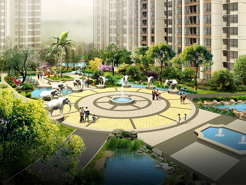 噴泉、神獸泉等多種水景景觀妝點園區(qū),賦予園區(qū)生動的氛圍和聲響;采用硬質(zhì)景觀點題,在主要節(jié)點設(shè)計神獸雕塑、花臺、燈飾、陶藝等小品突出東南亞特點,